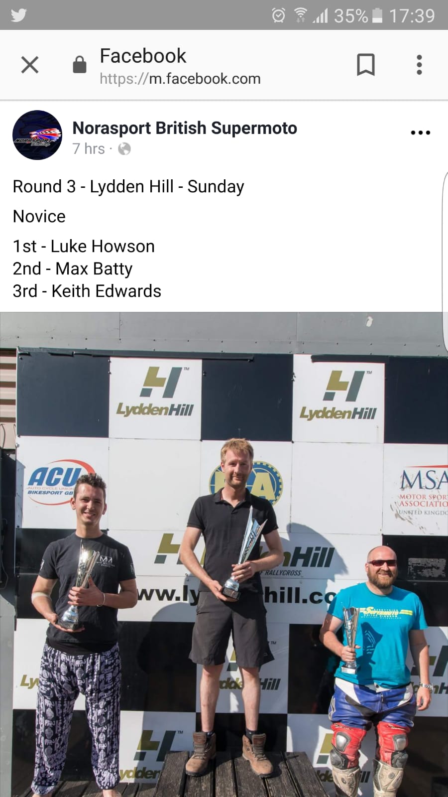 Congratulations to Luke Howson for coming 1st in the Novice category for round 3 of the British Supermoto Championship. He also managed a 3rd place in the 2-Stroke category to get a second podium place.